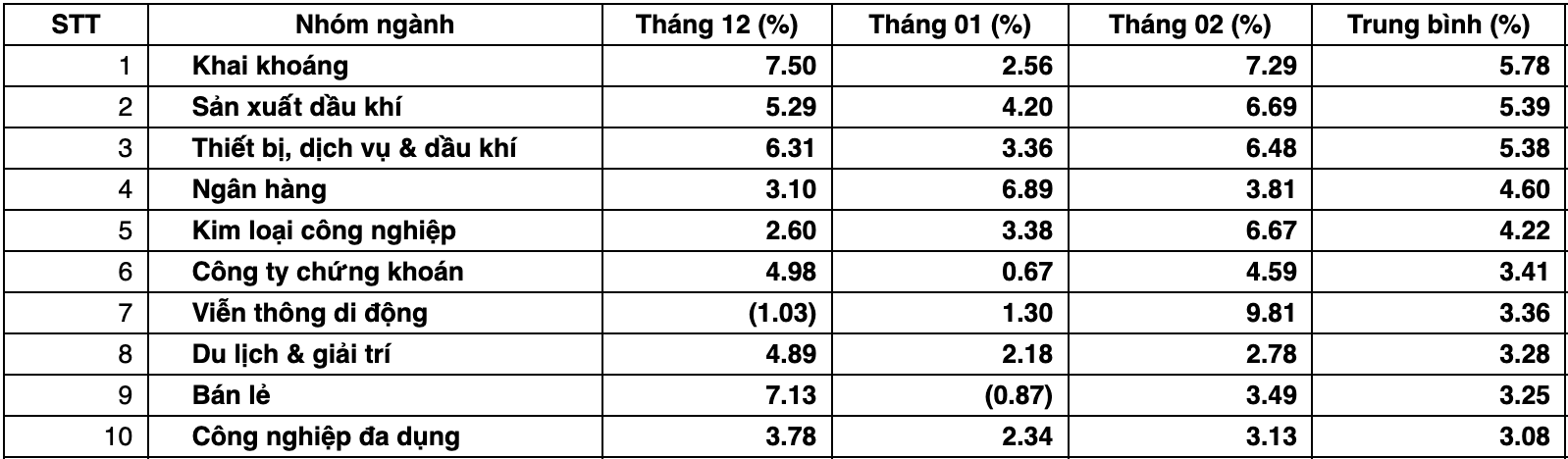 Cụ thể, trong 5 nhóm ngành nổi bật nhất ghi nhận ngành Khai khoáng, Dầu khí và Ngân hàng. Đây là những “ngôi sao” thực sự trong giai đoạn này, ông Minh cho biết. Chi tiết hơn, nhóm ngân hàng có sự bứt phá mạnh nhất vào tháng 1, còn 2 nhóm Dầu khí và Khai khoáng lại duy trì phong độ cực tốt xuyên suốt cả 3 tháng.