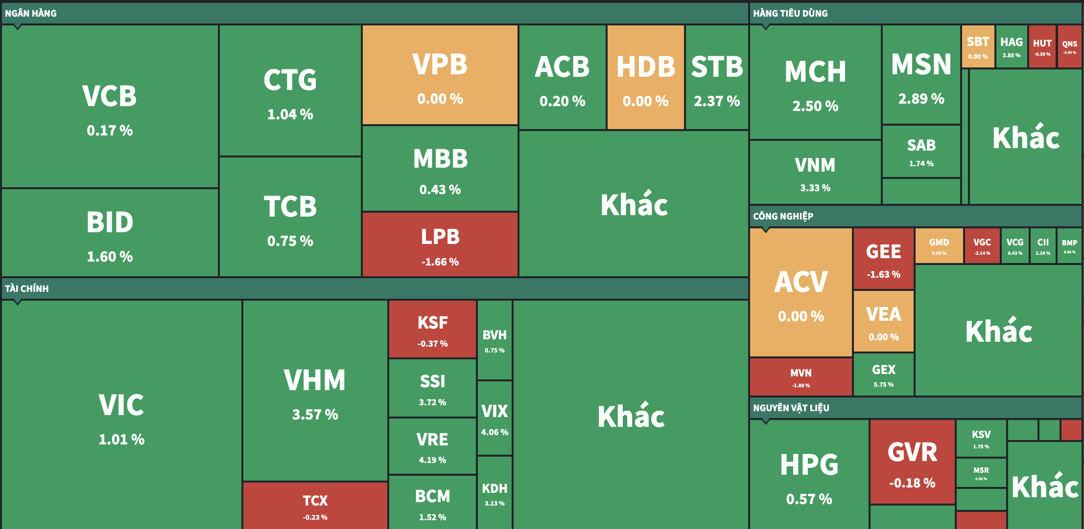 Tiếp đến là nhóm hàng tiêu dùng, thực phẩm đồ uống khi VNM nay tăng được 3,33% trong khi 2 mã nhà Masan là MCH và MSN đều tăng trên 2%.