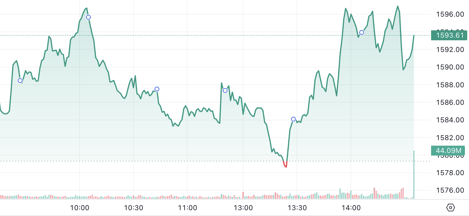Trong cả phiên, VN-Index đã có 4 lần tăng đến ngưỡng 1.596 - 1.597 điểm, bao gồm 1 nhịp trong phiên sáng và 3 nhịp trong phiên chiều. Tuy điều chỉnh nhẹ và không thể kết phiên ở mức giá cao nhất, tuy nhiên những tín hiệu này cũng đã cho thấy sự phục hồi trong tâm lý.