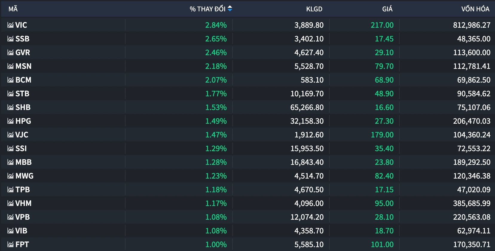 Cùng với VIC, loạt mã cổ phiếu vốn hoá lớn tăng tốc và cùng nhau kéo chỉ số, như HPG, MSN, STB, FPT, VPB, VHM, MBB.