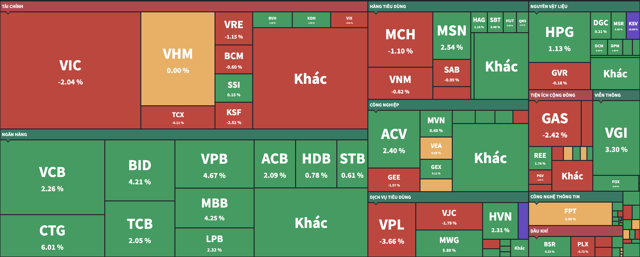 Trên sàn HoSE, số lượng mã tăng giá chiếm phần đa, 2/3 cổ phiếu trên sàn đều tăng giá, thoát cảnh “xanh vỏ đỏ lòng” của các phiên trước. Tâm lý tích cực lan rộng với phần lớn các nhóm ngành tăng điểm.
