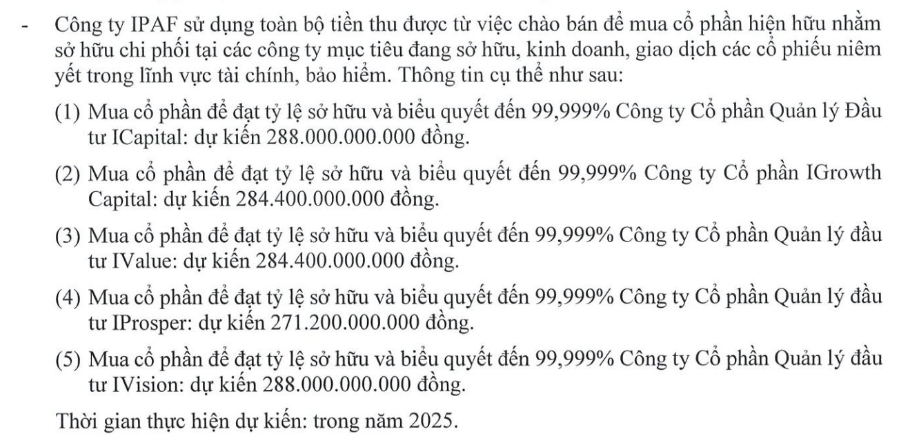 Sau khi huy động được vốn mà phần lớn là từ IPA, IPAF sẽ sử dụng toàn bộ số tiền thu được từ đợt chào bán để mua cổ phần đạt tỷ lệ sở hữu, biểu quyết đến 99,99% tại 5 công ty: CTCP Quản lý Đầu tư ICapital, CTCP IGrowth Capital, CTCP Quản lý Đầu tư IValue, CTCP Quản lý đầu tư IProsper và CTCP Quản lý Đầu tư IVision. Số tiền phân bổ để mua cổ phần tại các công ty trên dự kiến lần lượt là 288 tỷ đồng - 284,4 tỷ đồng - 284,4 tỷ đồng - 271,2 tỷ đồng và 288 tỷ đồng.