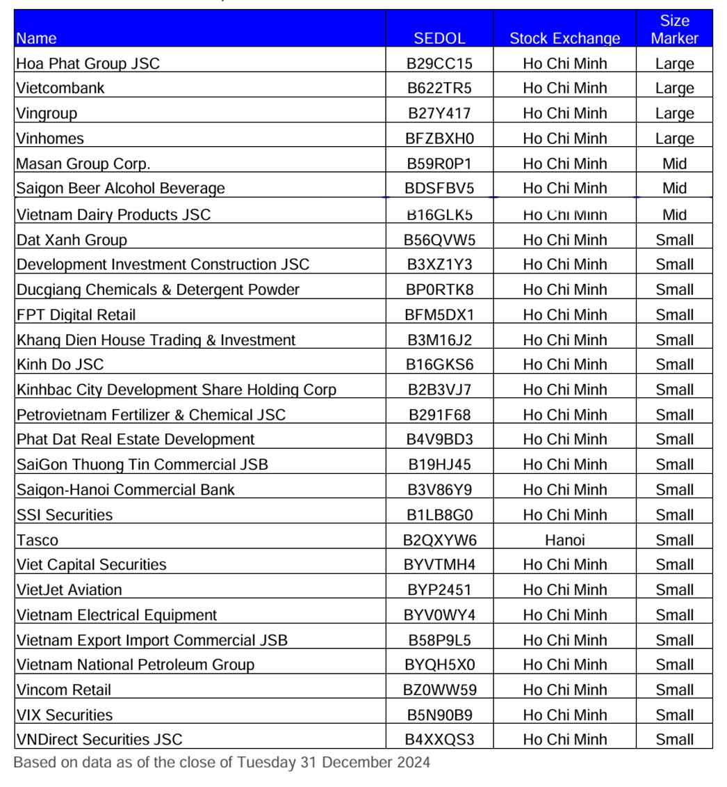 | 28 mã cổ phiếu đáp ứng tiêu chí sàng lọc của FTSE Global All Cap tính đến 31/12/2024. Nguồn: FTSE Russell |