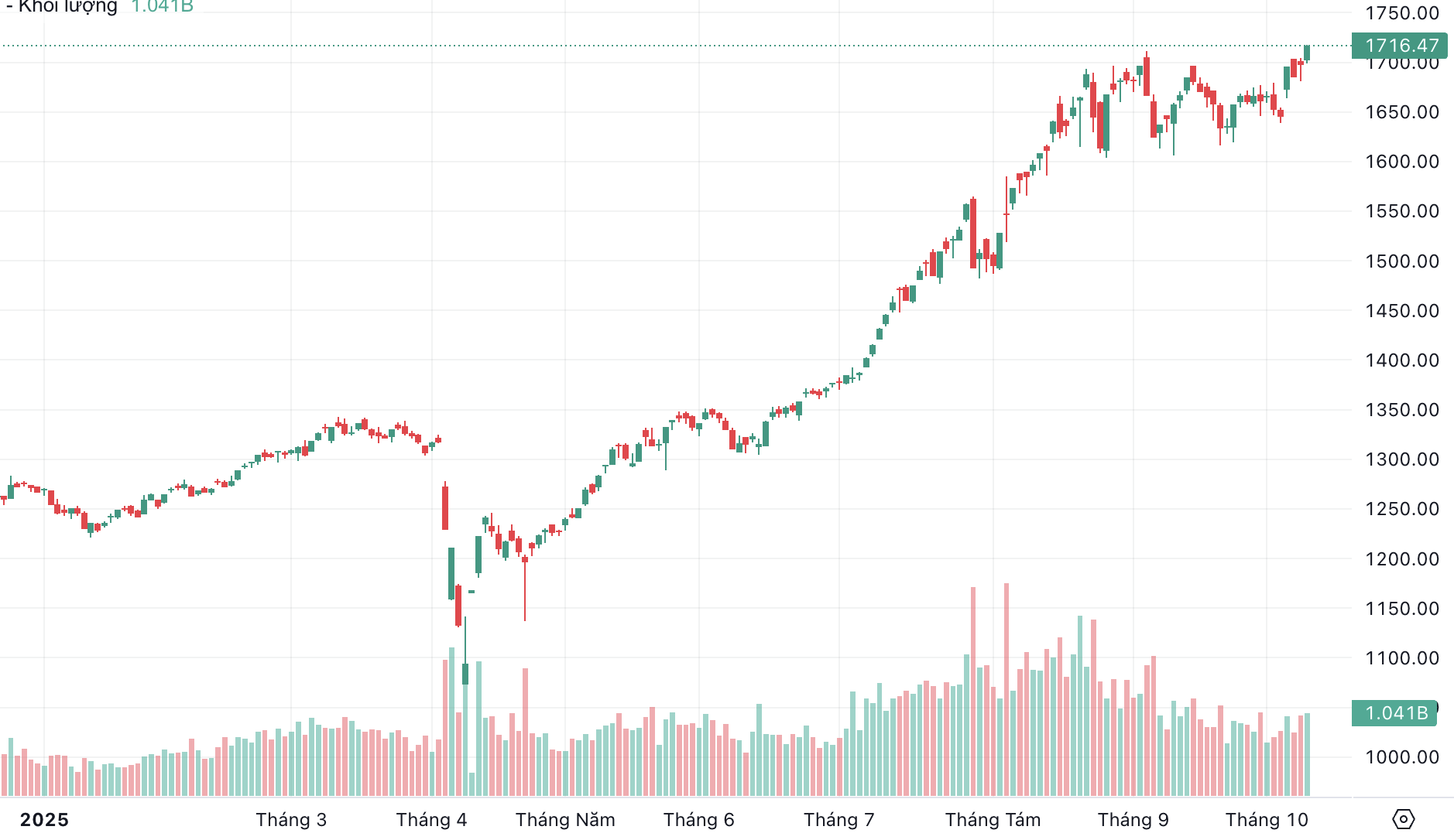 | VN-Index đóng cửa ở mức 1.716,47 điểm ngày 9/10/2025. |